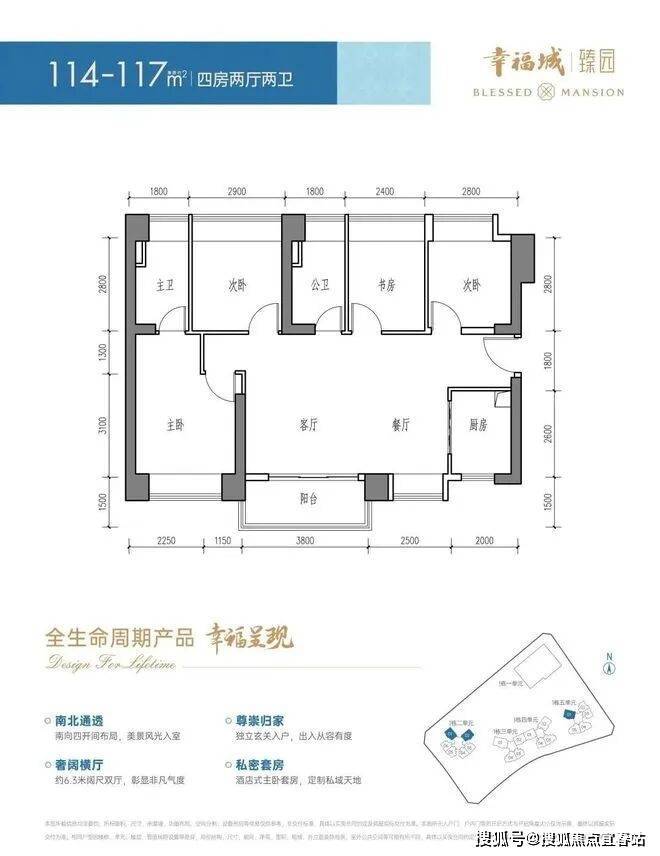 114-117㎡4房2卫,横厅南北通透格局,得房率约84.87-87.1%(包含赠送),阳台主朝西南或东南向。