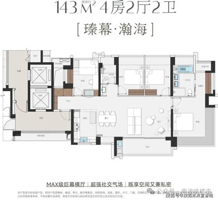 户型方面,主推建面115㎡-143㎡四房,户型使用率超100%,最大可达108%,最高赠送面积近44㎡。