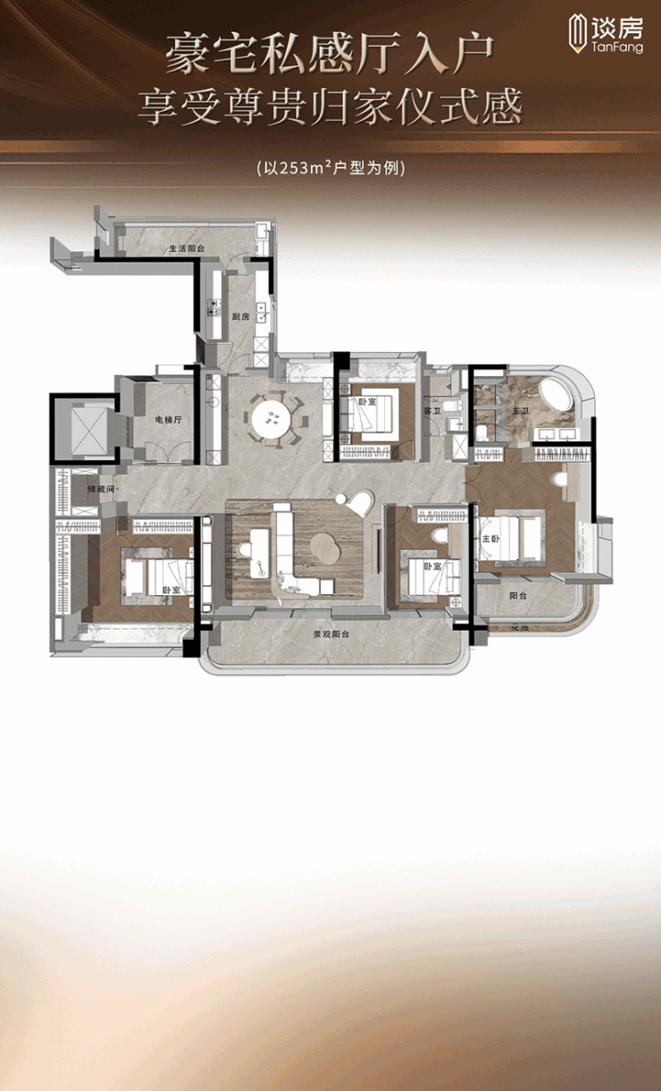以253㎡户型为例,电梯门开,私属侯梯厅的金属挂钩已轻托公文包的重量。