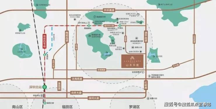 交通配套:周边直线3km范围内有2个地铁站(牛湖、观澜湖),轨道交通发达,距离最近的地铁站是牛湖。周边直线1km内有14个公交站,距离最近的华侨山庄站仅有229m,周边公共交通极为便捷。