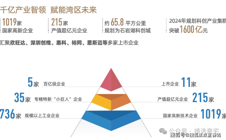 石岩科创城(规划面积65.8万平方公里)汇聚高端科技资源,驱动产业升级,形成产业集群效应,成为推动区域经济高质量发展的关键引擎。在2024年已汇集超过1019家国家高新技术企业,拥有215家产值超亿元企业,已汇聚欣旺达、深圳创维、惠科、裕同、恩斯迈等11家上市企业,规划科创产业集群突破1600亿元。