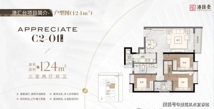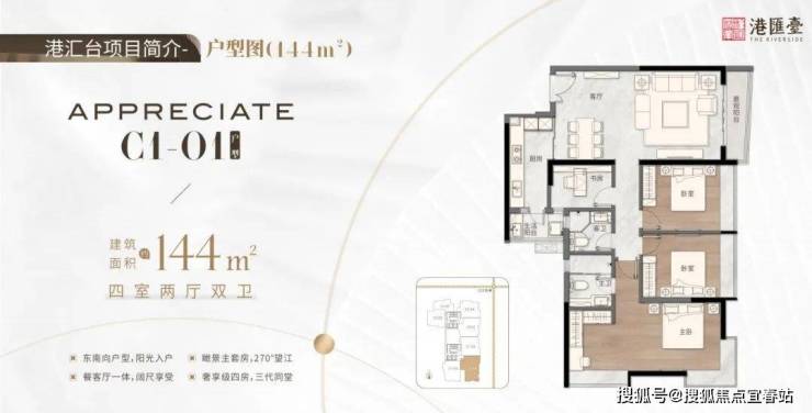 :东南向 270° 环幕江景,餐客厅一体 + 瞰景主卧套间,三代同堂也不显拥挤;