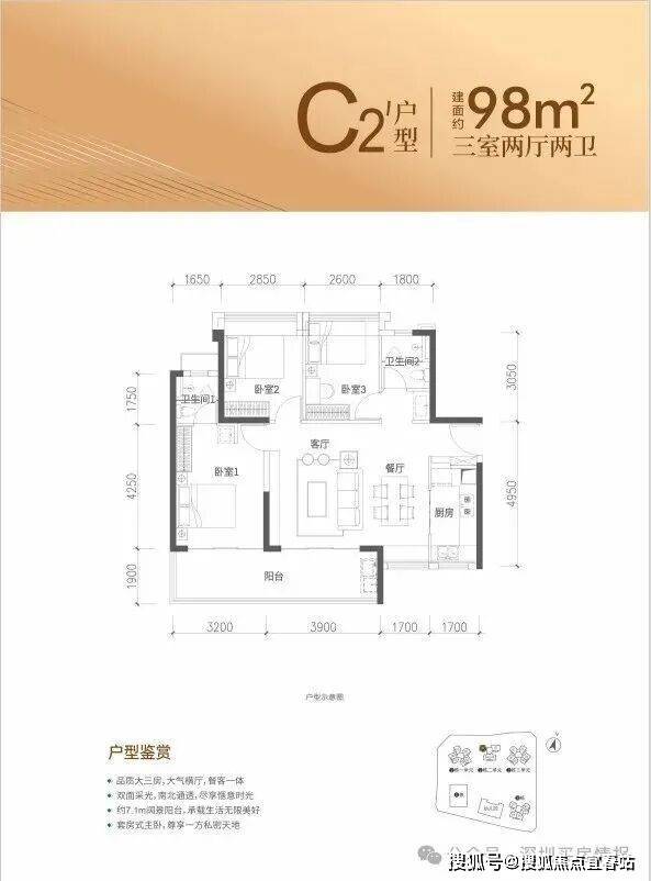 特点:LDKB一体化设计,主卧11.3㎡(含飘窗),次卧7.28㎡(含飘窗)x2。