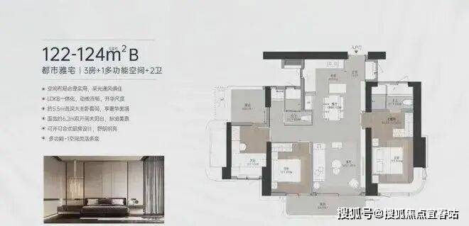 【122-124㎡ 3+1房2卫】B户型:双龙抱珠户型,次卧带阳台。西北朝向(06 )看绿地公园及花园