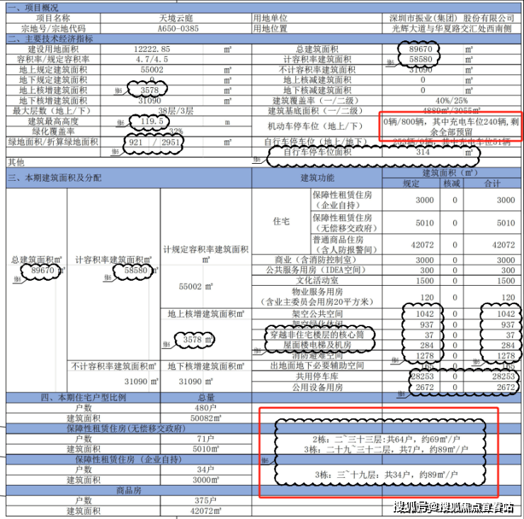 总规划480户,其中商品房375套,公租房71套,企业自持租赁住房34套,1/3栋是3梯5户设计,2栋2梯5户设计,地下3层,规划停车位800个,车位占比1:1.66。