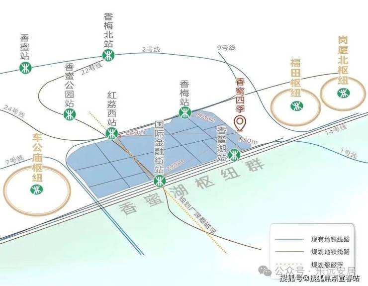 项目距离最近的地铁站是9号线香梅站和1号线香蜜湖站,地铁1号线香蜜1站车公庙,2站福田中心,3站后海深圳湾,项目离9号线香梅站300米,步行5分钟,1号线香蜜湖站500米,步行8分钟。