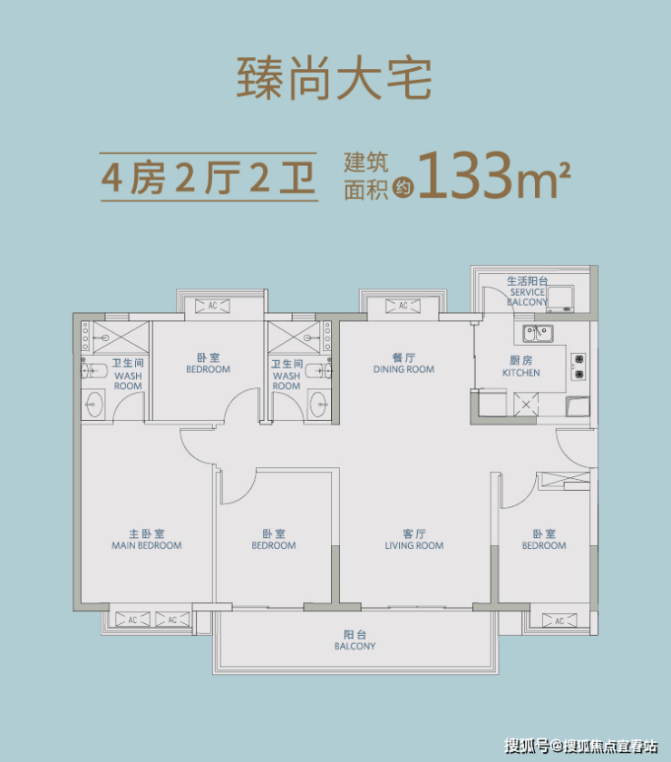 约133平方米的大四房户型,大面宽短进深设计,把南北对流的优势发挥到极致,营造出大户人家的气派感。长约7米的南向大阳台,敞亮舒爽,作为纯粹的享受空间;生活阳台尺度阔绰,晾晒收纳完全足够。