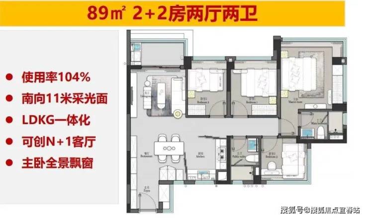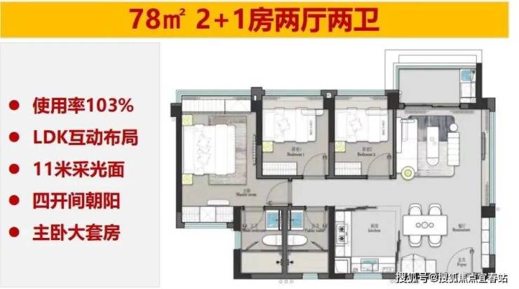 76㎡三房两卫:四开间朝南、窗地比高采光好、超103%实用率、双卫舒适。