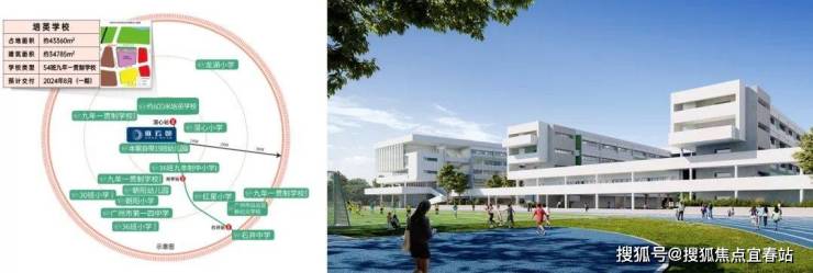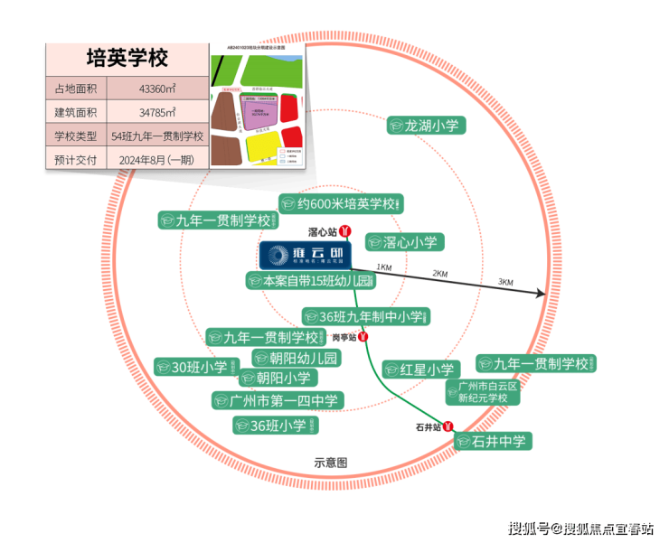 小区自己配建15班幼儿园。另外在建设中的54班广州龙头9年一贯制培英学校大概600米的距离。今年9月份开学。