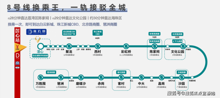 地铁交通:项目到8号线滘心地铁口约500米。地铁8号线可以快速换乘多条线路,白云出发轻松换乘抵达荔湾、越秀、海珠,途中可接驳1号线、2号线、3号线、5号线、广佛线等线路,畅达全城繁华商圈。