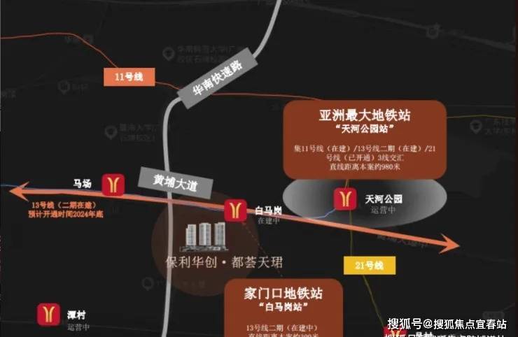 项目交通网络四通八达,三横三纵的主干道贯穿其间,无论是前往珠江新城、金融城还是其他城市热点区域,都能实现快速通行。同时,项目紧邻天河公园站和白马岗站两大地铁站,尤其是天河公园站作为三地铁交汇的枢纽站,未来出行将更加便捷高效。随着地铁11号线和13号线二期的建设推进,预计2024年底将正式开通,届时将进一步提升项目的交通优势。