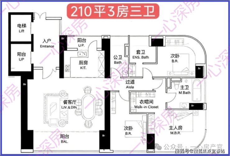1C栋(1栋三单元)-51层:4梯3户,约210㎡,为一期的入门级户型,一层三户。