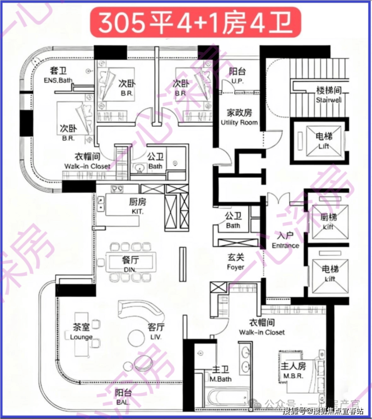 1D栋(1栋四单元)-45层:均为3梯2户,约305㎡,一层两户。