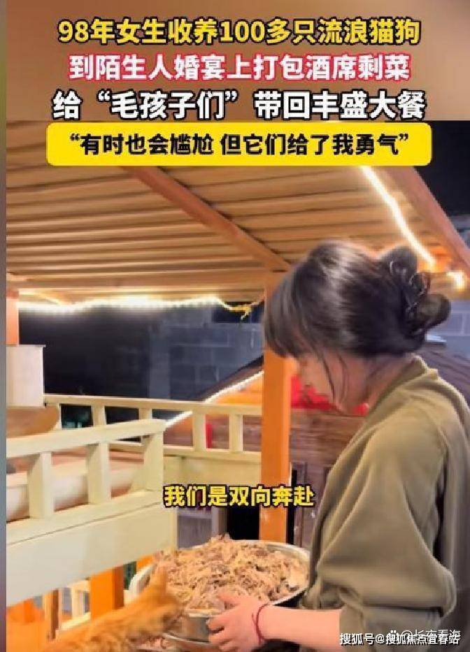 想到这个办法后,她就开始去婚宴打包剩菜了。宣宣本来有点害羞,但是为了猫咪们能吃饱,她就主动走到那些不认识的新人面前,然后说出自己的想法。通常呢,新人们都能理解她,也支持她。有的人甚至会很热情地请她坐下来一起吃。不过她都会很有礼貌地拒绝,但是她会在礼金簿上放个100块钱左右。她笑着说,这是“小猫小狗交的饭钱”。我觉得这个细节特别暖心,也体现了她对新人的尊重。