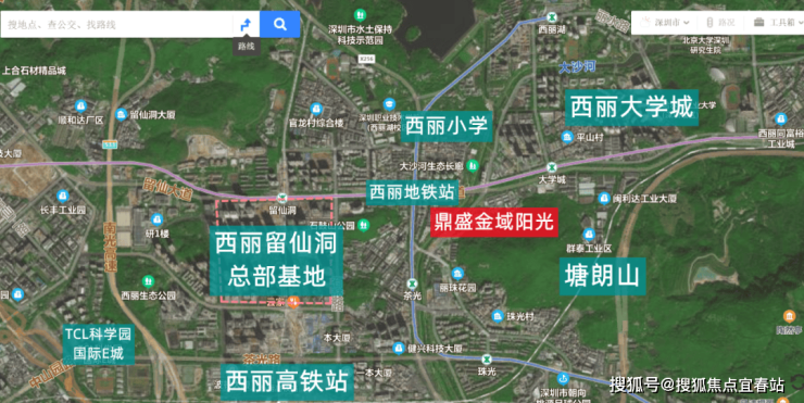 鼎胜金域阳光家园西侧为 西丽留仙洞总部基地,东北侧为 大学城,东侧为 塘朗山,西南侧是 西丽高铁站。