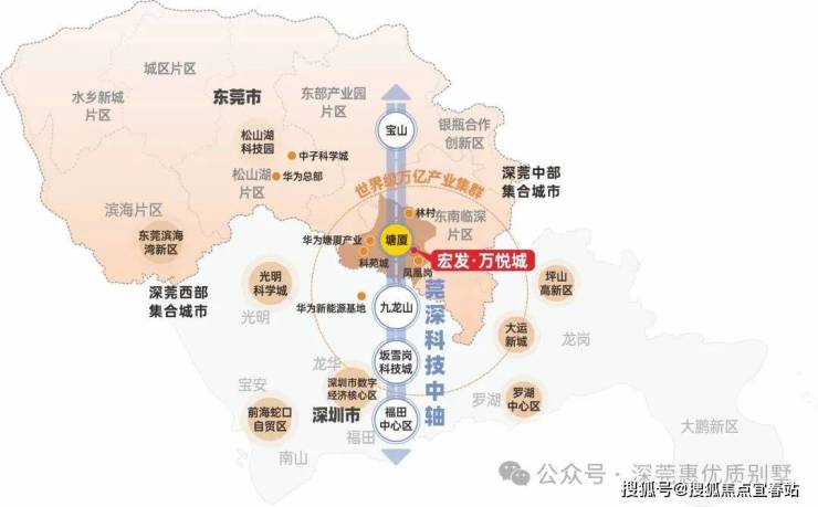 宏发·万悦城择址塘厦核心区,鲤鱼塘水库旁,以万亩湖园为圆心,集“产、学、研、融、商、居”六位于一体。 项目地处临深新一代电子信息产业基地范围内,是东莞市首宗通过单一主体挂牌招商并完成要约收购工作的产城融合连片改造项目,总占地面积约796.8亩,创下东莞单一主体挂牌招商成功交易项目面积之最。近年来,塘厦立足“东南门户、产业重镇”的全新定位,凭借两面临深的地理优势,提速建设“临深新一代信息产业基地”。随着华为的重磅落地,未来塘厦将坐拥以华为牵头形成的万亿级产群利好,再现“松山湖”奇迹。