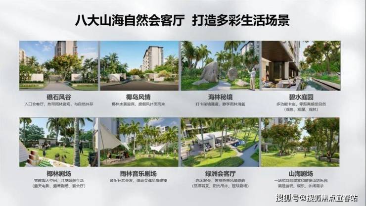 以“山与海的自然共享客厅”为设计理念,提取海风、椰林、礁石、滩涂,雨林、绿洲等滨海度假元素,规划八大山海共享自然会客厅,尽享诗意徜徉。