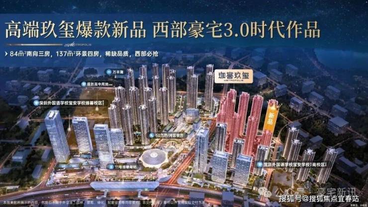 珈誉玖玺项目位于深圳宝安大道与凤塘大道交汇处,总建面约40.53万㎡,规划有10栋31-48层的高层、超高层住宅,总户数2479户。户型包括约75-97㎡的3房、约110-199㎡的4房等类型。