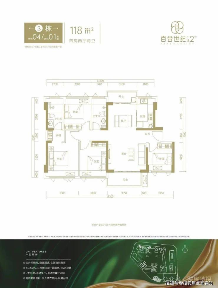 118㎡的4房2厅2卫,3栋1单元04/3栋2单元01户型,设计的是竖厅南北通透格局,进门入户玄关,客厅4.15米开间,客餐厅分离设计,南北双阳台,得房率约76%(不含赠送),阳台主朝西南或东南向。套内面积89.68㎡+赠送15.44㎡=105.12㎡,加上赠送得房率约89.08%。
