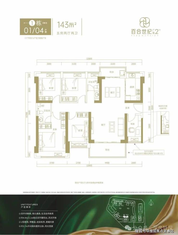 143㎡的5房2厅2卫,3栋1单元04/3栋2单元01户型,设计的是竖厅南北通透格局,进门入户玄关,客厅4.4米开间,客餐厅分离设计,南北双阳台,得房率约76%(不含赠送),阳台主朝西南或东南向。套内面积108.68㎡+赠送17.22㎡=实得125.9㎡,加上赠送得房率约88.04%。