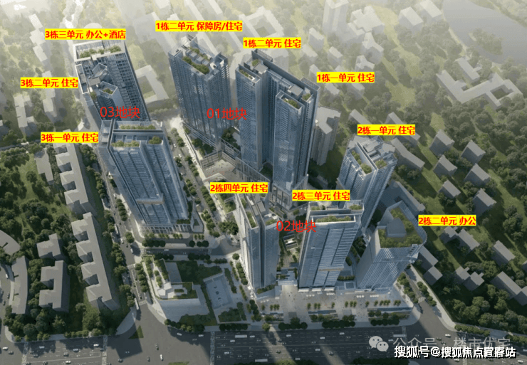02地块规划3栋53层·、51层、53层超高层住宅(2栋一、三、四单元),以及1栋办公楼(2栋二单元),住宅、商业、办公及酒店为一体的大型综合项目。