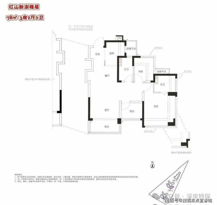 78㎡的3房2厅2卫,设计的是竖厅格局,客厅3.4米开间,LDKG+X空间一体化,S墙设计预留冰箱卡槽位,动静分区,三开间朝南,主卧+1个次卧都是双飘窗设计,次卧带1个设备平台放空调机位,U型厨房,卫生间干湿分离,公卫带1个设备平台可日常使用,得房率:100%(包含赠送),西南或东南朝向。