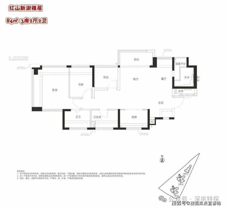 84㎡的3房2厅2卫,设计的是横厅南北通透格局,客厅3.4米开间,LDKG+X空间一体化,动静分区,主卧南北通设计,餐厅位带1个设备平台,U型厨房,卫生间干湿分离,得房率:100%(包含赠送),阳台东北朝向。