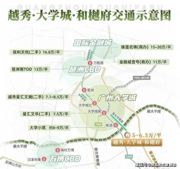 交通配套大学城和樾府销售中心距离最近的地铁站是4号线新造站,走路过去地铁站也就是900多米,坐地铁4站可到万博,琶洲,5站金融城。自驾方面也是很方便的,南大干线已经开通,串联起广州南站、汉溪长隆、万博CBD、大学城、国际创新城、广汽基地等番禺核心板块,5min直达万博中心;金光东隧道已经通车,5min直通大学城一期。同时也 让一二期资源得以链接、整合,真正融合成为一个整体。