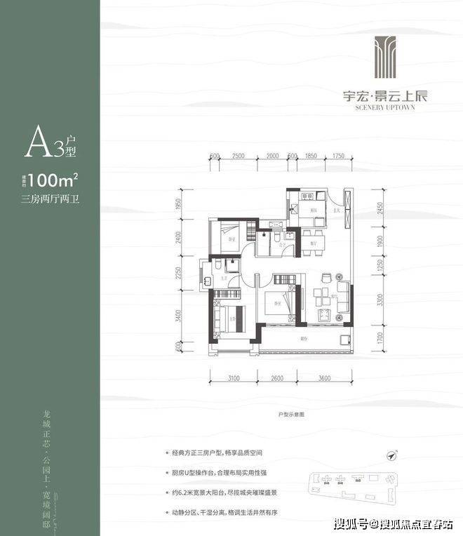 100㎡的3房2厅2卫,设计的是竖厅格局,客厅3.6米开间,LDKB一体化,三开间朝南,3个卧室分别做到了3.1米/2.6米/2.4米的宽度,客厅连接次卧出6.2米长的大阳台,U型厨房,卫生间干湿分离,得房率约76%(不含赠送),东南朝向。