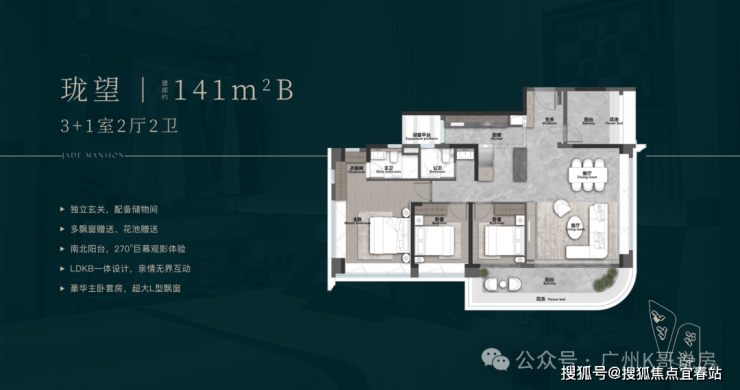 该户型可南望海珠湿地公园,昼夜间能独享湿地公园景色,这通常是约200㎡以上大平层的私享,珑璟台约123㎡即能拥有!