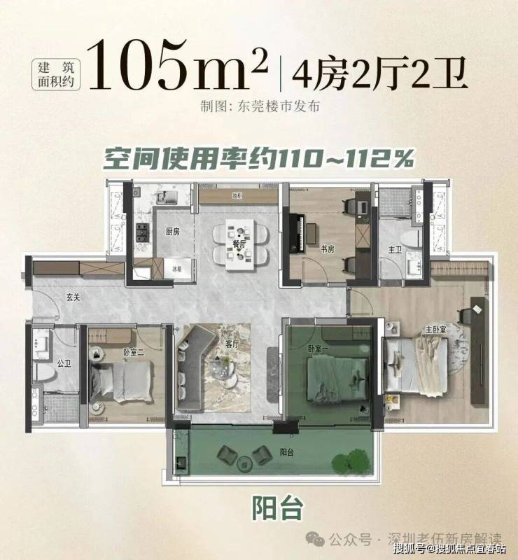 建面约105平四房,使用率约110-112%。