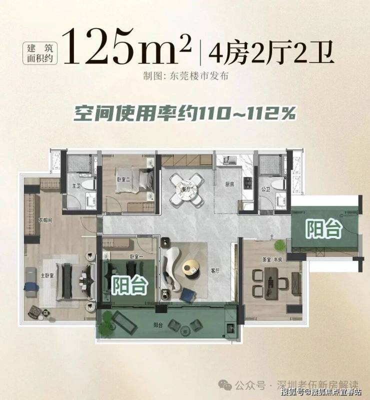 建面约125平四房,使用率同样约110-112%,相当于传统150+平的大平层。