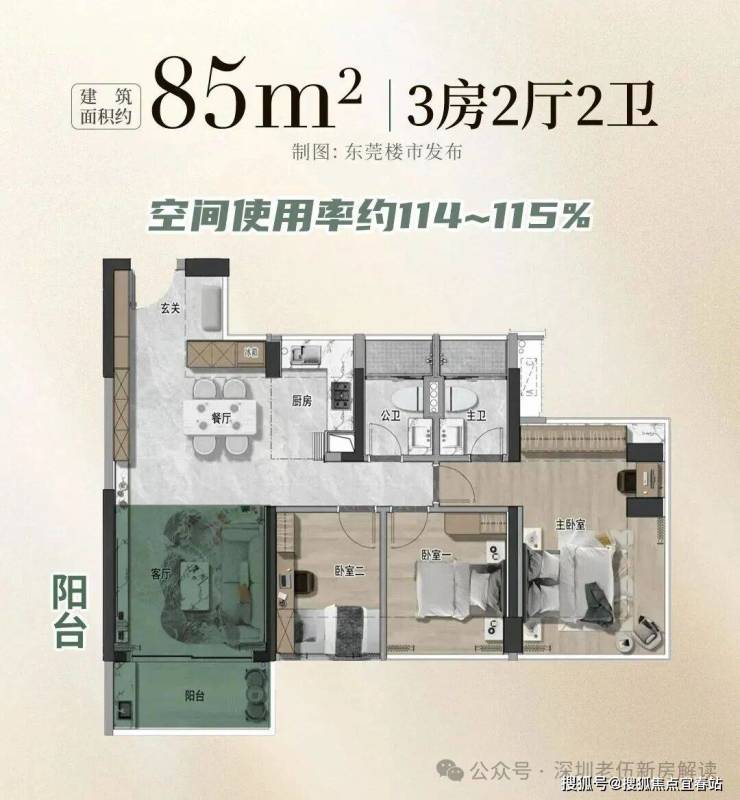 比如,建面约85平的三房,使用率约114-115%。客厅与阳台相连,仅计算一办面积,最大限度的增加了赠送空间。