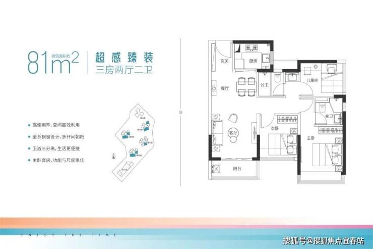 以西北、西南、东北朝向户型为主,每栋均有分布,采光通风好,使用率高户型方正通透,3开间朝南,采光通风好;户型紧凑,布局合理,使用率超高;卫生间3分离设计,干湿分离,互不干扰。每个卧室都带有飘窗,空间感强。