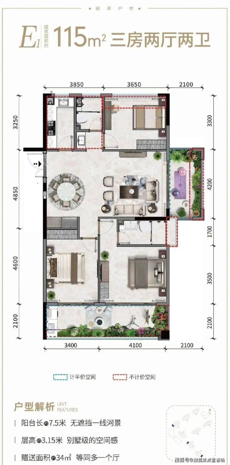 ②产权式酒店,户型南北通透,面积93-145㎡两房至四房。赠送超大面积,93㎡两房一卫、97㎡小三房两卫、115㎡三房两卫、141㎡四房三卫;阳台面宽高达12米,部分阳台可270°三面河景。