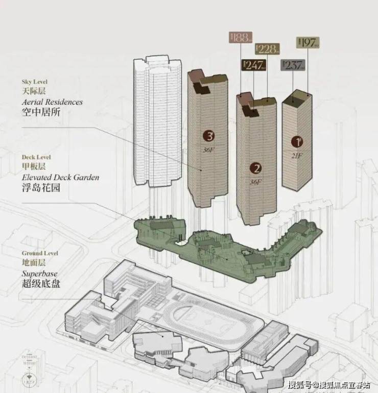 集合多家大师级机构的智慧,以浮岛甲板的设计手法,打造功能复合的“超级底盘”,将整个社区抬高12米,构筑出两个能量完全不同的“场域”。