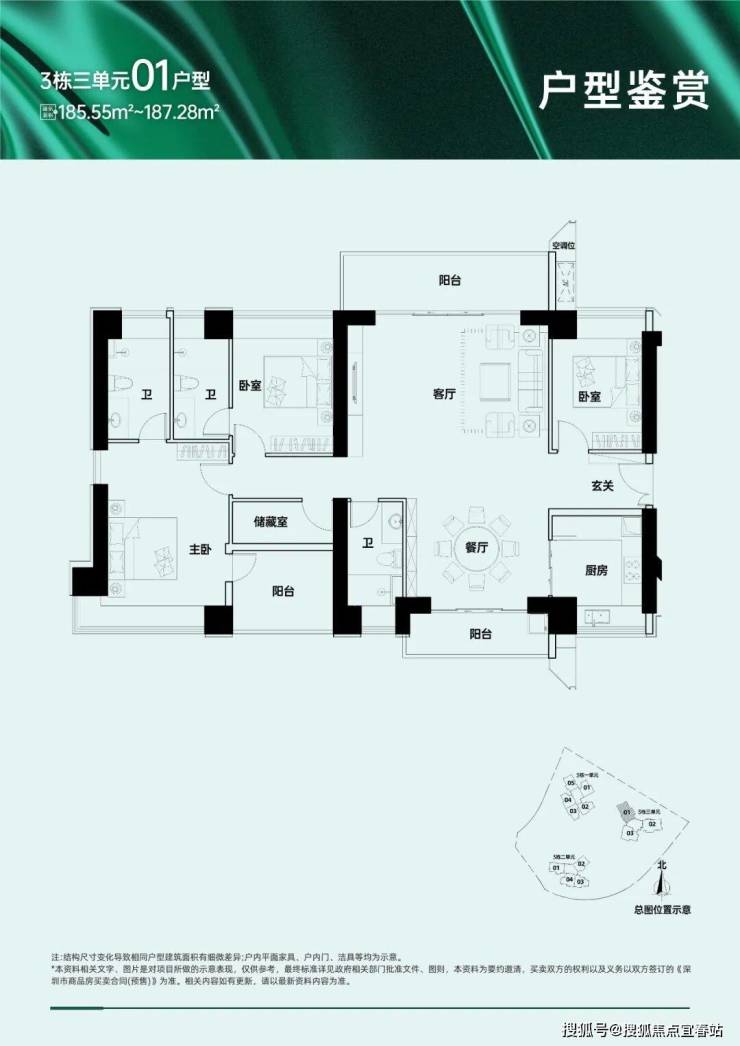特点:经典竖厅布局,三、四单元,西北向,朝向地铁和城市道路,道路噪音对户型影响较大,高层视野开阔可俯瞰长岭陂水库和西丽生态绿地,背面阳台和边上的储物间可调整为一个房间,赠送面积较多,餐客厅方正,户型整体没有硬伤