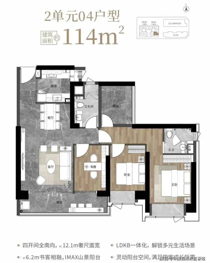 114㎡的4房2厅2卫,1栋2单元04户型,设计的是经典竖厅格局,客厅3.85米开间,LDKB一体化设计,动静分区,四开间朝南,12.1米面宽,二字型厨房,卫生间干湿分离,客厅连接次卧出6.2米长大观景大阳台,正南朝向。
