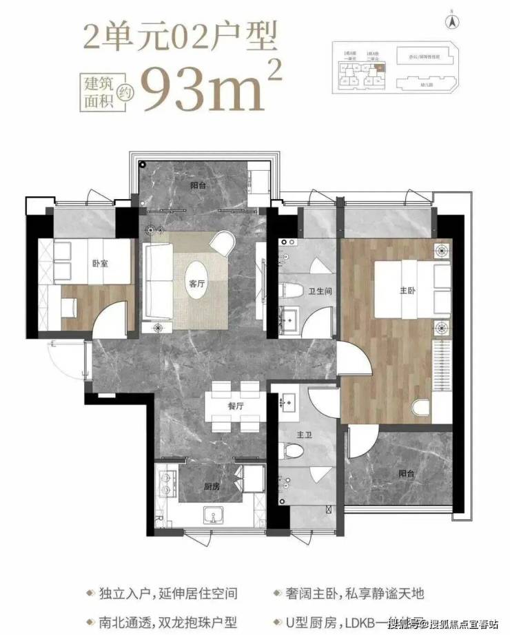 93㎡的3房2厅2卫,1栋2单元02户型,设计的是竖厅南北通透格局,独立入户,客厅3.6米开间,客餐厅分离设计,U型厨房,卫生间干湿分离,阳台正北朝向。