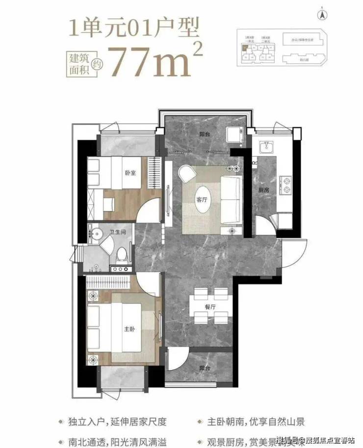 77㎡的2房2厅1卫,1栋1单元01户型,设计的是竖厅南北通透格局,独立入户,客餐厅分离设计,动静分区,南北双阳台,L型厨房,卫生间干湿分离,客厅阳台正北朝向。小户型里面难得可以做到南北通透且有双阳台的格局。