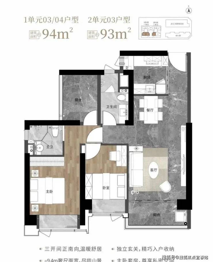 93-94㎡的3房2厅2卫,1栋1单元03、04户型/1栋2单元03户型,设计的是经典竖厅格局,客厅3.6米开间,LDKB一体化设计,动静分区,三开间朝南,9.4米面宽,二字型厨房,卫生间干湿分离,阳台正南朝向。