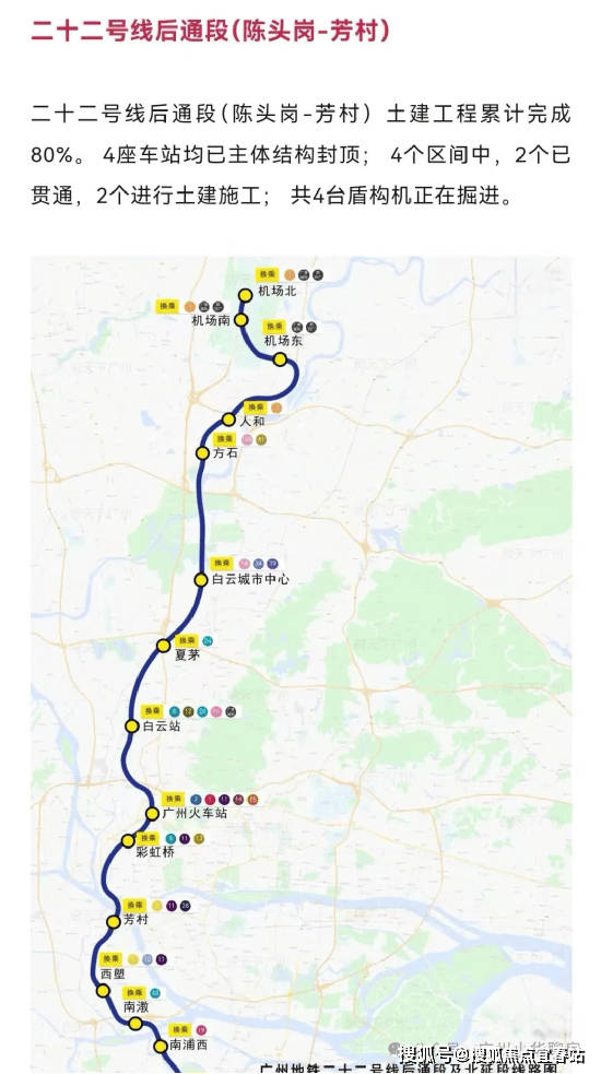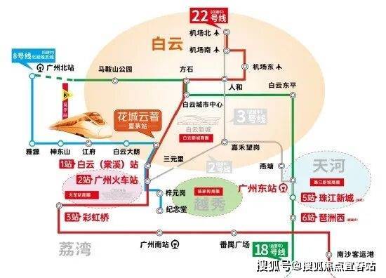 22号北延线,广州南北大动脉,时速达160公里,贯穿空港、白云棠溪、广州火车站、南站等7大枢纽,全线换乘高达16处之多,无缝接轨广州全市。