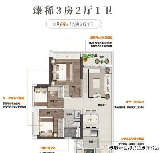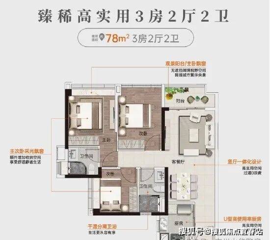 主、次卧采光飘窗,干湿分离卫浴,U型厨房