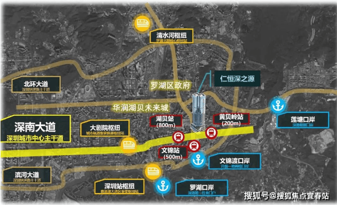 占位:国家级区位 深港融合C位0世界四大湾区之一粤港澳大湾区领头羊.国家战略赋能:2香港北部都会区将全域对接罗湖,项目距离文锦渡口岸仅800米,深港融合第一触点