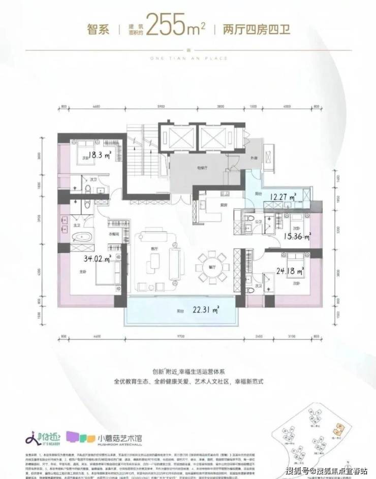 255㎡的4房2厅4卫,1栋1单元01/02户型,设计的是竖厅双龙抱珠格局,专梯入户送超大私用入户空间,客厅9.7米开间,LDKB一体化设计,主卧带大衣帽间,三套房设计,分别做到了主卧34.02㎡/次卧24.18㎡/次卧18.3㎡/次卧15.16㎡(包含墙体飘窗),客厅连接餐厅出9.7米长的大阳台约22.31平,J型厨房带1个生活阳台约12.27平,卫生间干湿分离,得房率约96.7%(包含赠送,不含入户空间),西南或东北朝向。飘窗赠送面积24.8㎡+阳台赠送17.29㎡=实际赠送42.09㎡(不含电梯入户空间)。