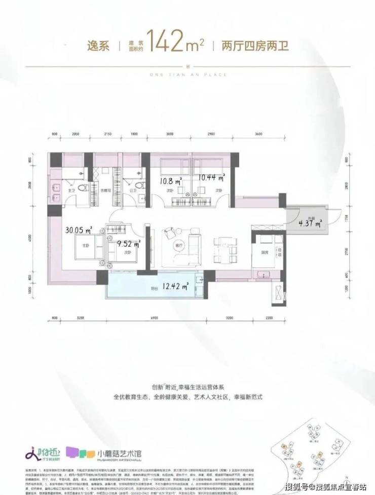 142㎡的4房2厅2卫,2栋1/2/3单元02户型,设计的是横厅南北通透格局,独门独户,赠送约4.37平的入户空间,客餐厅7.3米开间,LDKB一体化设计,五开间朝南,主卧带大衣帽间,分别做到了主卧30.05㎡/次卧10.8㎡/次卧10.44㎡/次卧9.52㎡(包含墙体飘窗),客厅连接次卧出6.9米长的大阳台约12.42平,U型厨房,卫生间干湿分离,得房率约104.2%(包含赠送),西南或东南朝向。飘窗赠送面积23.8㎡+阳台赠送6.21㎡+外廊赠送4.37㎡=实际赠送34.38㎡。