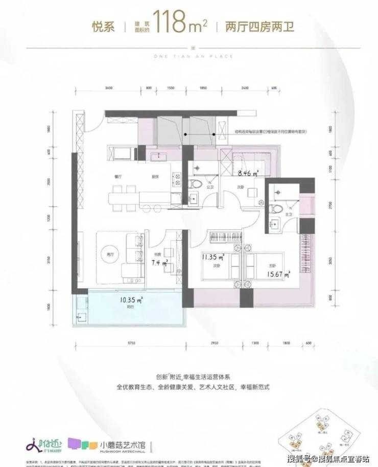 118㎡的4房2厅2卫,1栋2单元03/04户型+2栋1/2/3单元03.04.05户型,设计的是竖厅格局,进门约6.12平的入户玄关位,客厅3.5米开间,LDKB一体化设计,四开间朝南,动静分区,分别做到了主卧15.67㎡/次卧11.35㎡/次卧8.46㎡/次卧7.4㎡(包含墙体飘窗),客厅连接次卧出5.75米长的大阳台约10.35平,U型厨房,卫生间干湿分离,得房率约96.5%(包含赠送),西南或东南朝向。飘窗赠送面积14.31㎡+阳台赠送面积5.17㎡=实际赠送19.48㎡。