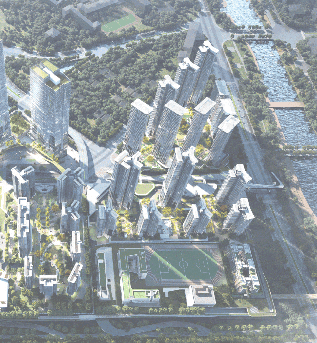 同时颠覆围合式布局,以生态中轴绿廊为核心,构建了一个融合居住、教育、办公、公园等的超级生态圈。