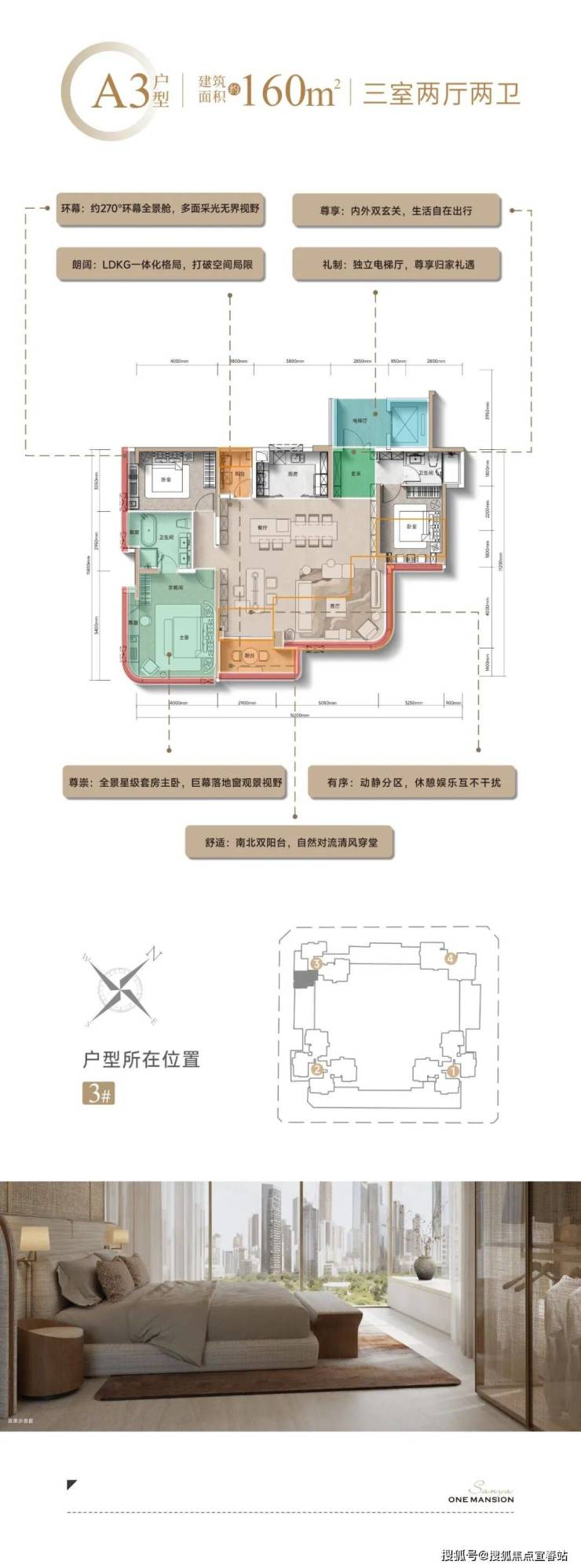 160㎡户型:一梯一设计,入门级三室两厅两卫规划,主卧+次卧+客厅+餐厅构成的约16M超大面宽,以独栋尺度造平层,270°全景视野,采光视野更好,带星级主卧套房。