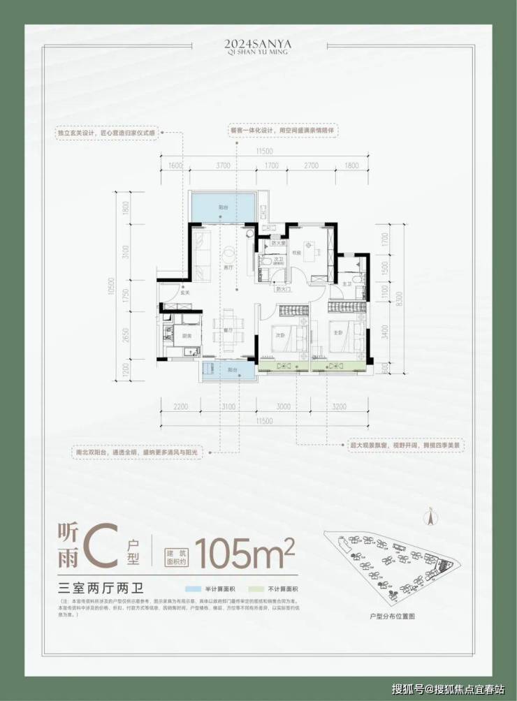 📍 听雨 C户型-建面约105㎡ 三室两厅两卫